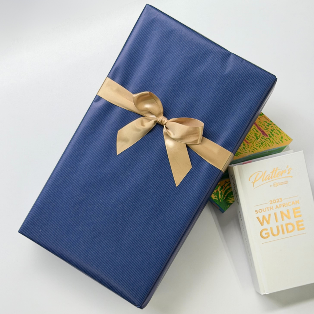 ギフト包装内容・あたたかみのあるワインカラーの2本入りボックス・青色無地の包装紙・リボン(ゴールド)